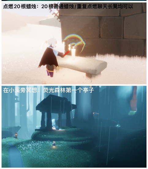 去遇境的水池,点燃3个蜡烛堆。再去衣橱那离,点燃一排蜡烛,这样数量就有20根了。如果遇境的蜡烛已经被点燃了,可以去地图里点。