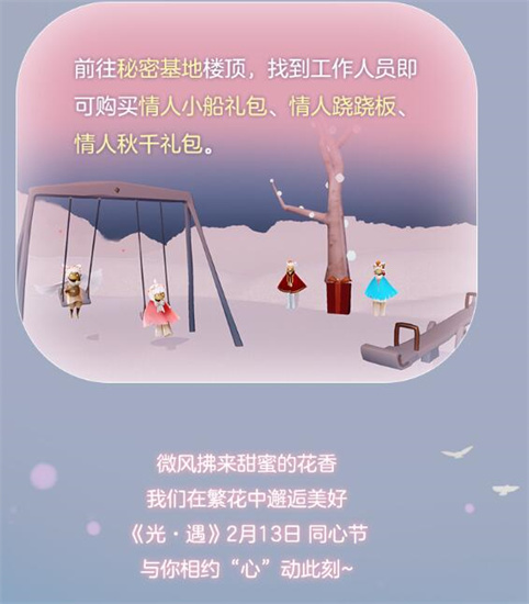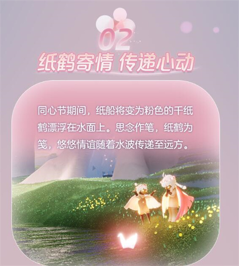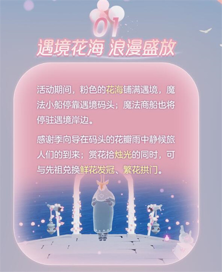 光遇同心节活动是什么?光遇是一款能够治愈人们心灵的游戏,在游戏中没有无穷无尽的任务,玩家只用一边欣赏游戏绝美的世界,一边畅游在舒适的天地之间,享受游戏带来的轻松惬意氛围,让玩家抛掉生活中的各种苦闷情绪,在游戏中放下浮躁的心情,全身心的投入到游戏之中,细细的感受光遇世界带来的阵阵暖流。那么到底光遇同心节活动是什么?轻舟悠悠,遇境花海盛放。我们执手相约浪漫花瓣雨中,在繁花拱门前许下真挚心愿,炫彩的爱心烟花点亮夜空,和纸鹤一起见证此刻心动,2月13日 0:00 ~ 2月26日 23:59,《光·遇》同心节 浪漫开启,活动期间,粉色的花海铺满遇境,魔法小船停靠遇境码头;魔法商船也将停驻遇境岸边。感谢季向导在码头的花瓣雨中静候旅人们的到来;赏花拾烛光的同时,可与先祖兑换鲜花发冠、繁花拱门。