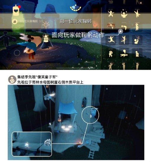 光遇2.13每日任务是什么?光遇是一款有趣好玩的社交冒险游戏,玩家将在游戏中感受一段最暖心的纯粹佘家冒险体验,在清新治愈的唯美游戏画面中,感受不期而遇的美好时刻,在柔美的云海之间,享受温暖和感动带来的精彩回忆,和心爱的伙伴携手,打动每一位玩家的心弦。那么到底光遇2.13每日任务是什么?找到一位好友,在动作列表中选择鞠躬动作就可以完成任务了。在雨林的密林遗迹可以找到这位先祖,点亮先祖后即可成功完成在雨林重温先祖的美好回忆任务。这个任务是非常简单的,主要是玩家要找到花,然后放火烧就好了,相信大家都能快速完成的。飞到雨林夹杂着云层这块区域后,向左前方飞行。最后就能在石碑附近的上空看到黄色光球,飞过去触碰它就能完成。
