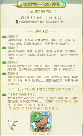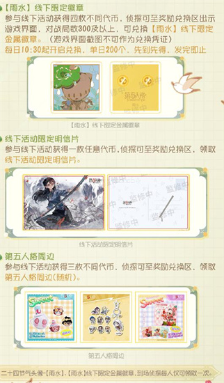 参与现场活动,各位侦探有机会获得二十四节气头像-【雨水】兑换卡、【雨水】线下限量徽章、线下活动限定明信片、第五人格周边等丰富奖励~
