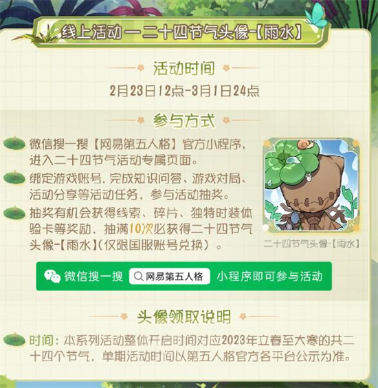 参与方式:微信搜一搜【网易第五人格】小程序,进入二十四节气活动专属页面,绑定游戏账号、参与活动并完成任务,参与活动抽奖,抽满10次必得二十四节气头像-【雨水】。详情请于活动开始后查看小程序活动细则。