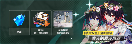 主线三十五章「然后,向着明天」即将开启,舰长参与主线活动共可获取彼岸双生全新服装「春天的爱沙尼亚」、崩坏3第一部纪念册、全新舰桥外港「驶向未来」、水晶×480等奖励~