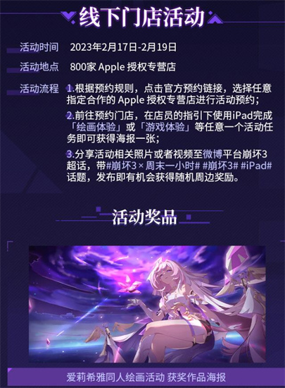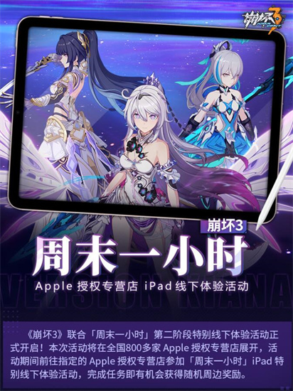 《崩坏3》联合「周末一小时」第二阶段特别线下体验活动正式开启!本次活动将在全国800多家 Apple 授权专营店展开,活动期间前往指定的 Apple 授权专营店参加「周末一小时」iPad 特别线下体验活动,完成任务即有机会获得随机周边奖励。