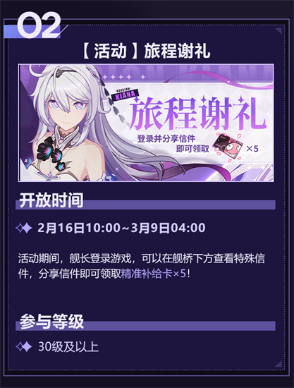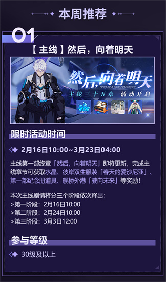 崩坏3最新活动是什么?崩坏3是一款有趣好玩的手机游戏,游戏中的每个角色都有不同的四个版本,都有着各自的特点,但是无一例外都非常的漂亮,从人设就可以看得出来,制作人在游戏的造型方面下足了功夫,无论是游戏的建模还是场景都非常细致,同时任务的活动也是非常自然顺畅的。那么到底崩坏3最新活动是什么?舰长好,为舰长预告本周游戏活动情报!主线三十五章「然后,向着明天」即将开启,舰长参与主线活动共可获取彼岸双生全新服装「春天的爱沙尼亚」、崩坏3第一部纪念册、全新舰桥外港「驶向未来」、水晶×480等奖励~「旅程谢礼」活动登场,活动期间舰长登录游戏,在舰桥下方可开启特殊信件,分享即可领取精准补给卡×5。所以下面就为大家带来崩坏3最新活动月之版本周刊第五期。