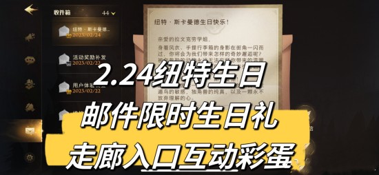 哈利波特魔法觉醒纽特生日彩蛋在哪?哈利波特魔法觉醒是一款由网易游戏发行,正版授权的RPG手游,游戏讲述了玩家和原著角色一同进入霍格沃兹魔法学校学习魔法的故事,玩家将在复古欧式的游戏美术风格氛围中,享受前所未有的游戏体验。拥有属于自己独一无二的魔杖,体验紧张刺激的魔法对决,书写自己的魔法世界新篇章。那么到底哈利波特魔法觉醒纽特生日彩蛋在哪?【2.24纽特生日彩蛋&邮件生日礼】✦生日彩蛋✦限时邮件生日礼记得领取,霍格沃茨城堡的走廊入口处,有纽特生日互动彩蛋,为了帮助不清楚的小伙伴能够更好地了解纽特生日的彩蛋位置,所以下面就为大家带来哈利波特魔法觉醒纽特生日彩蛋位置分享,感兴趣的小伙伴们就一定不要错过啦!